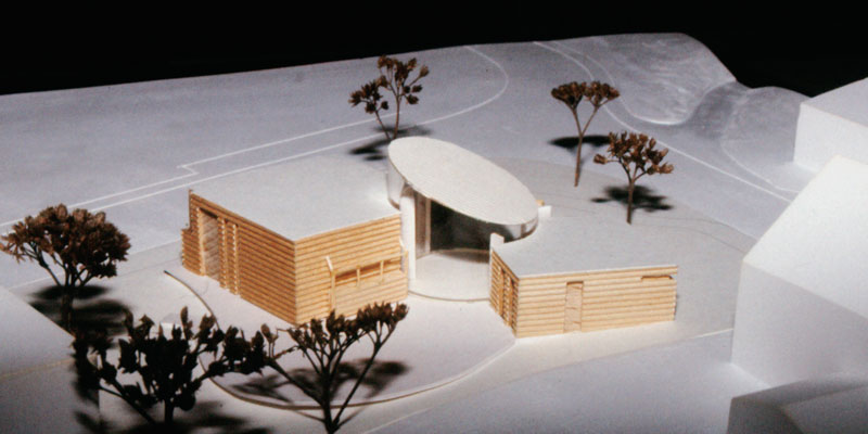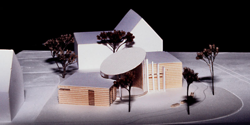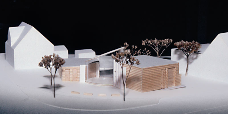 Der mit natürlichem Licht durchflutete Eingangsbereich des Kirchlichen Gemeindezentrums verbindet die Veranstaltungsräume und ist gleichzeitig deren Erweiterung. Es gibt keine Flure. Die Flächen werden multifunktional benutzt.