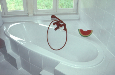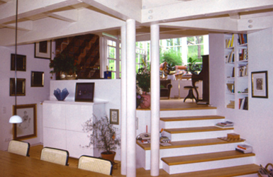 Jeder Raum wurde sorgfältig nach der Sonne und dem hügeligen Gelände ausgerichtet. Der durchgehende Stil verbindet die einzelnen Räume, die jeweils individuell gestaltet und teilweise mit Kunstwerken ausgestattet sind. Die Wohnung lässt sich wie eine Landschaft begehen mit jeweiligem starkem Sichtbezug nach aussen.