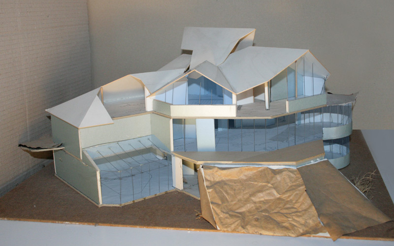 Wohnhaus am Hang mit Hausschwimmbad. Das achteckige Esszimmer hat eine Dachverglasung mit integrierten Sonnenschutzfolien.Die Hauptkonstruktion besteht aus vorgefertigten Holzwänden, die eine kurze Montagezeit ermöglichten. Aus jedem Stockwerk ist der Zugang ins Freie möglich. Im Dachgeschoss jeweils auf einen wettergeschützten Dachgarten.